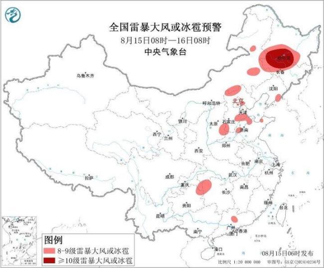今天6时,中央气象台发布了强对流天气蓝色预警和暴雨黄色预警。预计8月15日8时至16日8时,内蒙古中东部、东北地区中西部、华北、西南地区东部、华中西南部、山东北部、华南北部等地的部分地区将有8级以上雷暴大风或冰雹天气,其中黑龙江南部、吉林西北部等地的部分地区将有10级以上雷暴大风,最大风力可达11级以上。同时,这些地区还将出现小时雨量大于20毫米的短时强降水天气,部分地区如黑龙江南部、吉林西北部、河北东南部、天津南部、山东西北部、四川东部等地的小时雨量可能超过50毫米,甚至达到70毫米以上。