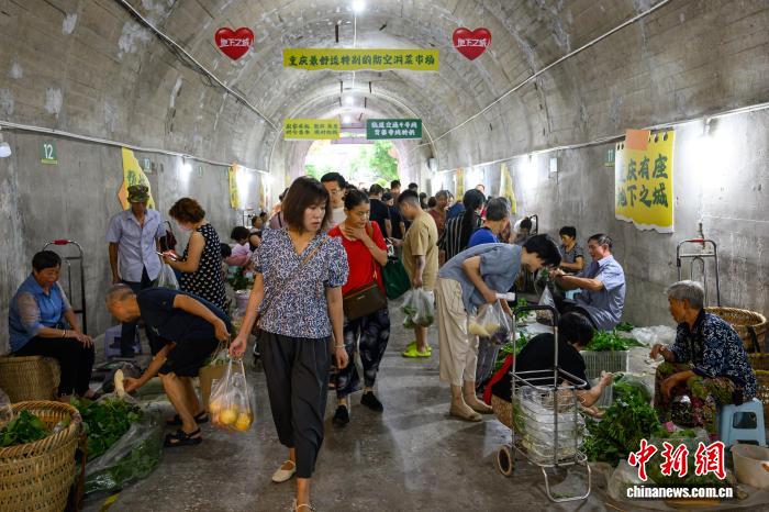 图为8月16日,市民在重庆渝北区的防空洞背篓菜市场选购蔬菜。中新社记者 何蓬磊 摄