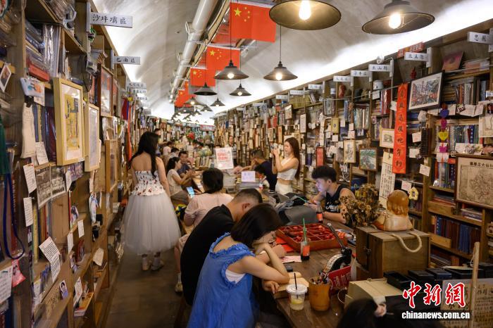 图为8月17日,市民、游客在重庆九龙坡区一个由防空洞改造的书店看书、拍照。中新社记者 何蓬磊 摄