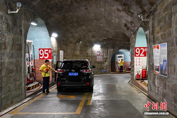图为8月17日,市民在重庆渝中区一个由防空洞改造的加油站为车辆加油。中新社记者 何蓬磊 摄