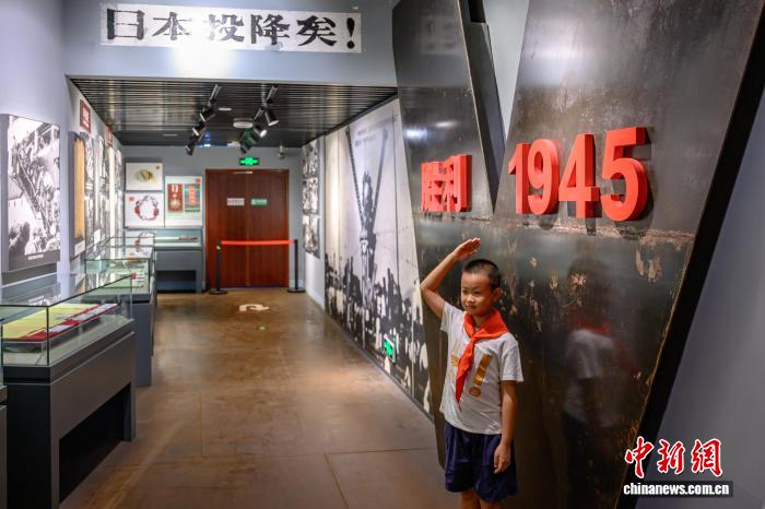 图为8月17日,一位小学生在重庆建川博物馆中的抗战文物博物馆参观后留影。中新社记者 何蓬磊 摄