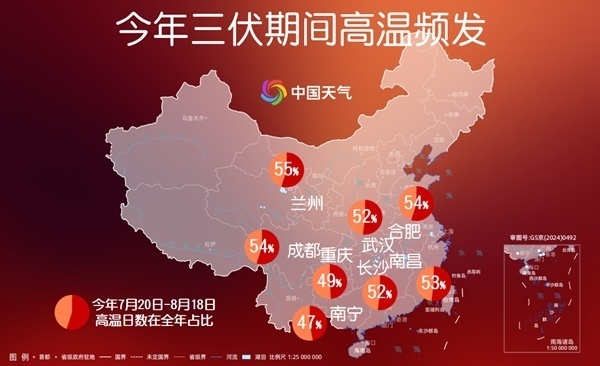 不仅炎热程度高,高温持续时间也长。新疆吐鲁番盆地及南部多地、内蒙古西部、四川盆地、湖北、湖南北部、江西中北部、浙江中部、福建西北部、安徽西北部、河南南部等地高温日数达15天以上,部分地区超过20天,其中吐鲁番盆地高温全勤。南北方多地高温日数破纪录,100多个国家级气象观测站高温日数为历史同期最多。大城市中,重庆、南昌、武汉和西安今年三伏期间高温日数也达到了20天以上。