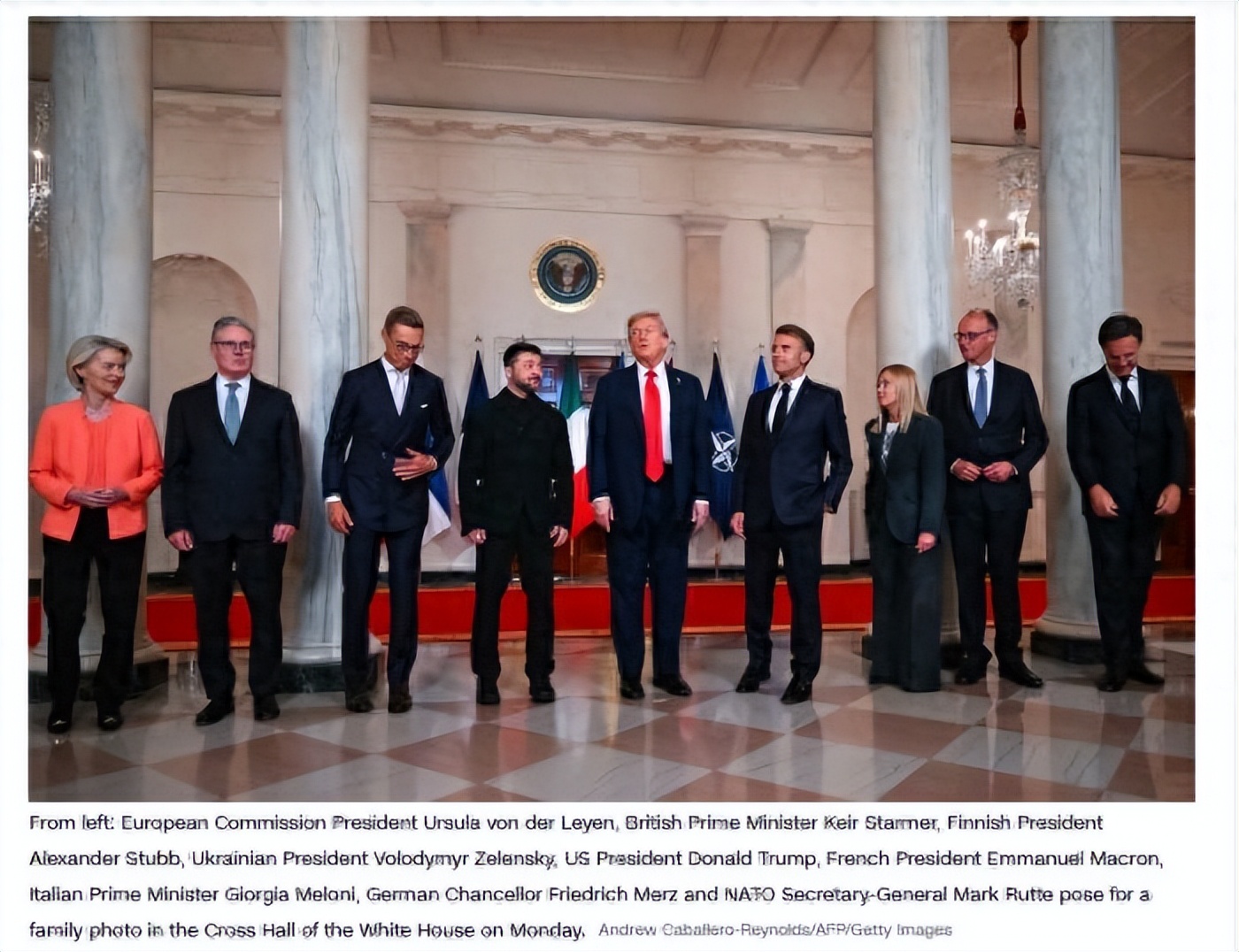 随后,特朗普和泽连斯基一同会见了英国首相斯塔默、法国总统马克龙、德国总理默茨、意大利总理梅洛尼和芬兰总统斯图布、欧盟委员会主席冯德莱恩和北约秘书长吕特等。特朗普先与泽连斯基举行会晤,之后,特朗普再与欧洲领导人会谈。而此前,泽连斯基与欧洲领导人已事先进行会谈。