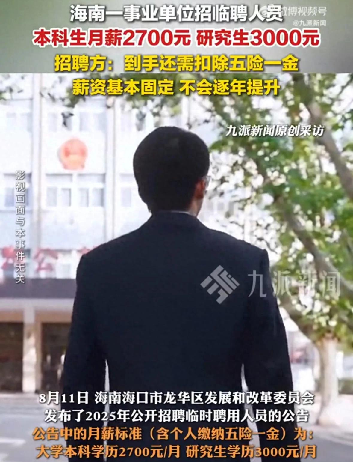 8月11日,海口市龙华区发展和改革委员会发布了《海口市龙华区发展和改革委员会关于2025年公开招聘临时聘用人员的公告》。公告中的月薪标准(含个人缴纳五险一金)为:大学本科学历2700元/月,研究生学历3000元/月。该薪资引发不少网友讨论。
