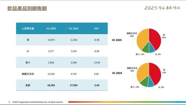 根据康师傅的中期业绩显示,康师傅总营收同比减少了2.7%,比去年同期少卖了11.09亿元。其中,饮品业务营收从去年同期的270.65亿元下降2.6%至263.59亿元,同比少卖了7.06亿元,降额最大。