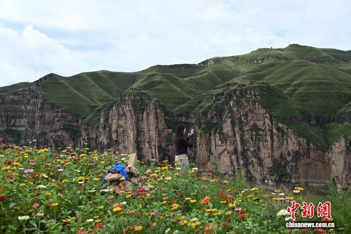 老牛湾的峭壁与花丛间,游客拍照打卡。中新网记者 刘文华 摄