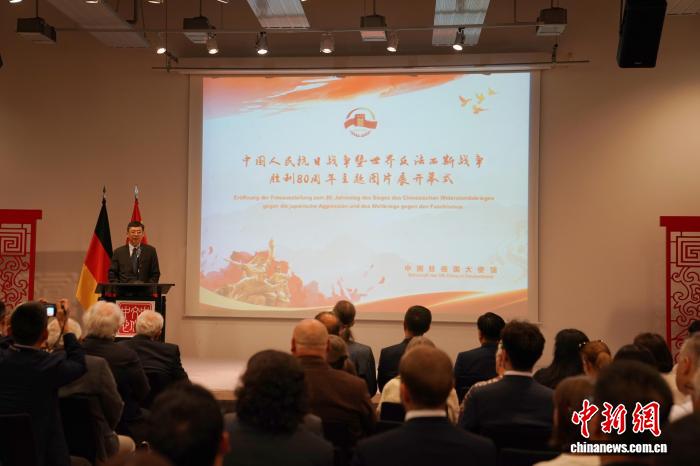 中新社柏林8月27日电 (记者 马秀秀)纪念中国人民抗日战争暨世界反法西斯战争胜利80周年图片展26日晚在柏林中国文化中心开幕。德各界人士、多国驻德使团代表、华侨华人等150余人参加。