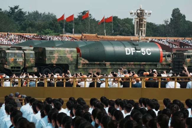 紧接着,核导弹第二方队也通过天安门广场接受了检阅。12台大型导弹运输车载着“东风-5C”液体洲际战略核导弹驶过广场。“东风-5C”作为我国战略反击体系的关键组成部分,具备全球打击能力,能够全时戒备并有效威慑潜在威胁。该方队由火箭军某基地牵头抽组而成。