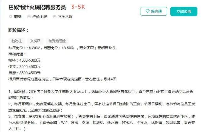 鳌头财经发现,巴奴在一知名招聘网站发布招聘信息显示,员工仅能“月休4天”。