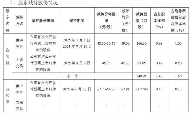 公告显示,股东白宝鲲先生于7月1日至7月10日减持了166.30万股,减持价格区间在48.50元—50.59元/股;9月2日以45.33元/股减持了83.65万股。此外,股东陈和军先生于6月12日减持了21.779万股,减持价格区间在52.70元—54.85元/股。在完成减持后,白宝鲲先生和陈和军先生分别持有立高食品8.22%和6.28%的股份。