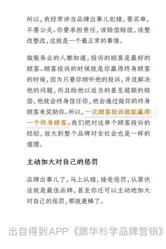 据了解,华与华曾在《跟华杉学品牌营销》的教学文案中表示,品牌出事儿犯错,要买单,不要公关,要承担责任,该赔偿赔偿,该整改整改。认罪伏法就是最佳品牌,甚至可主动加大对自己的惩罚,一次顾客投诉就能赢得一个终身顾客。