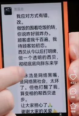值得注意的是,罗永浩还在当日直播间中展示了一位网友提供的,关于西贝创始人贾国龙道歉的完整截图。其认为,贾国龙说其是“网络黑社会”为诽谤。