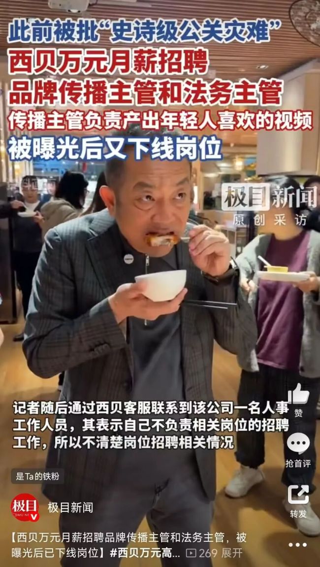记者随后通过西贝客服联系到该公司一名人事工作人员,其表示自己不负责相关岗位的招聘工作,所以不清楚岗位招聘相关情况。