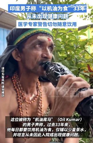 印度男子称每天喝机油连喝33年 医学专家警告勿模仿!印度卡纳塔克邦一名男子因声称每天饮用机油长达33年而引发广泛关注。这名被称为“机油库马”的男子表示,他每天只喝机油,并辅以少量茶水,从未因此住院或出现健康问题。视频中可以看到,库马坐在地上,喝下装在矿泉水瓶中的黑色机油,并拒绝了米饭和薄饼等传统食物。他认为自己的幸存归功于对神的信仰。