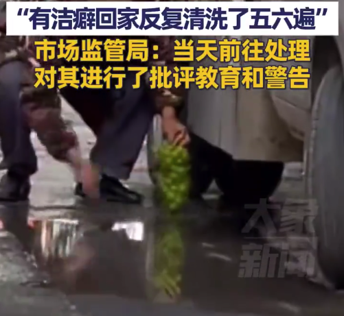 9月20日四川甘孜,顾客称水果贩用马路污水洗“阳光玫瑰”,“吃了半斤左右,因有洁癖回家反复清洗了五六遍”,22日市场监管局回应:联合综合执法局于当天前往处理,对涉事水果贩进行了批评教育和警告等方式。