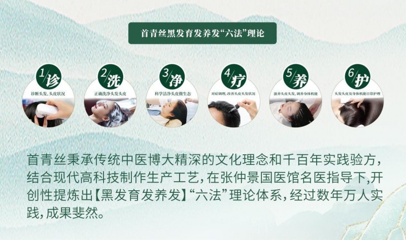 因此,围绕“六法”理论,首青丝打造了丰富的产品矩阵,推出青丝、健发、草本茶饮、痛症调理、日常洗护等八大系列产品,及时响应现代人对头皮头发养护的需求。并且始终遵循“炮制虽繁必不敢省人工,品味虽贵必不敢减物力”的原则,精选草本植物成分,兼顾安全性与有效性。