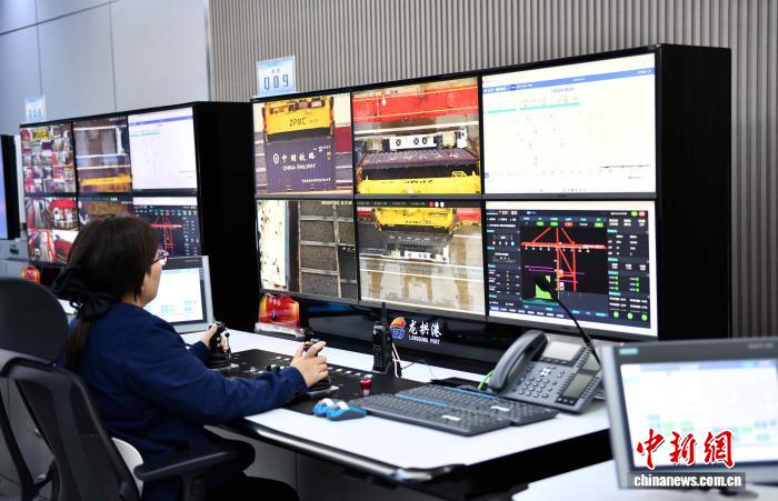 在济宁龙拱港内部控制中心,工作人员正在远程操控各类设备。沙见龙 摄
