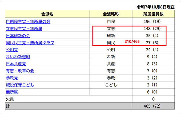 据《读卖新闻》报道,拥有148个议席的立宪民主党正考虑推举一位共同的在野党首相候选人。消息人士透露,立宪民主党党首、前首相野田佳彦近期与玉木雄一郎接触,但正式提名尚未确定。同一天,日本维新会也释放合作信号,大阪府知事吉村洋文表示,如果立宪民主党支持玉木参选,维新会愿意就投票事宜进行磋商。若三党结盟,其议员票总数虽不足过半,但仍将超越自民党单独掌握的议席。