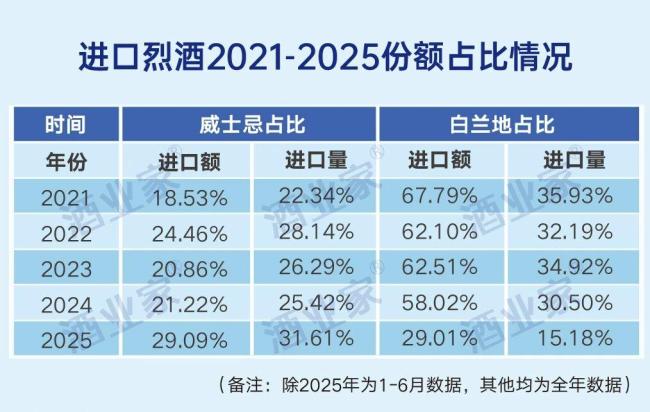 威士忌的反超并非偶然,而是过往势能的一次爆发。酒业家对比近5年的进口数据发现,威士忌与白兰地在进口量额上的份额差距在不断缩小,2023年虽有短暂回调,却也在消费氛围的不断提升下韧性增长,直至2025年上半年迎来集中爆发。