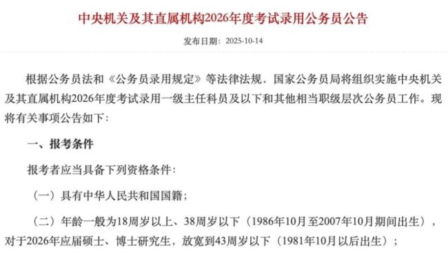 最近,国考年龄放宽的消息引发了广泛关注。根据中央机关及其直属机构2026年度考试录用公务员公告,公务员招录年龄上限由往年的35周岁调整为38周岁,对应届硕士、博士研究生,则放宽到43周岁以下。