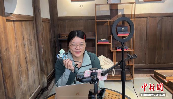 图为江越录制介绍绒花产品的视频。记者 何浠 摄