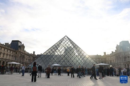 10月22日,在法国巴黎,大量游客聚集在卢浮宫博物馆的玻璃金字塔入口前。在法国卢浮宫抢劫案事发3天后,这座博物馆22日恢复开放。新华社记者 张百慧 摄