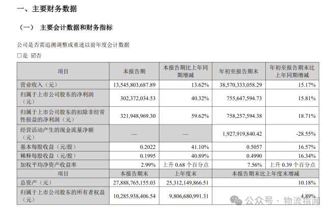 申通快递:第三季度营收135.46亿元,净利同比增四成