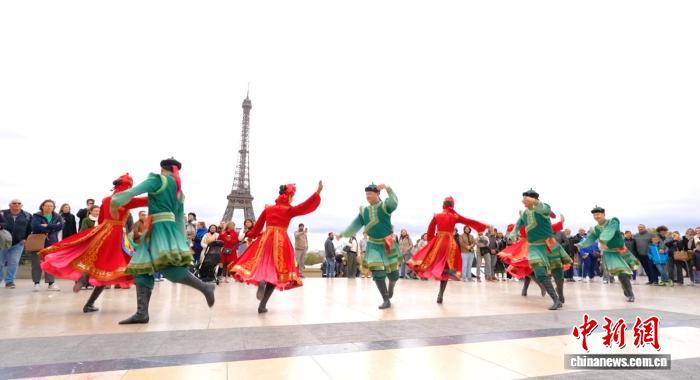 图为乌兰牧骑演员在埃菲尔铁塔下跳起蒙古舞。王禹 摄