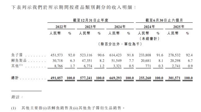 2022年至2024年及2025年上半年,公司鱼子酱销量分别为195.9吨、219.9吨、258.3吨及141.1吨,实现收入4.52亿元、5.23亿元、6.14亿元及2.79亿元,占比收入的92.0%、90.6%、91.8%及92.4%。
