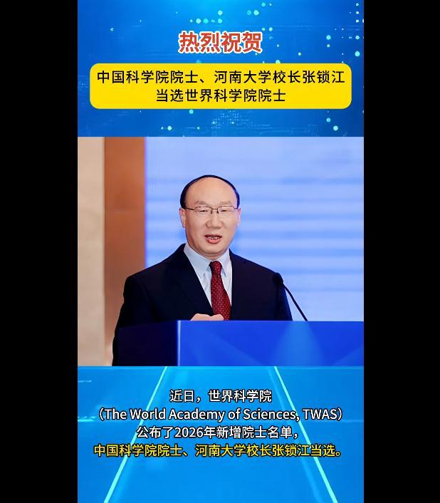 近日,世界科学院公布了2026年新增院士名单,中国科学院院士、河南大学校长张锁江当选。
