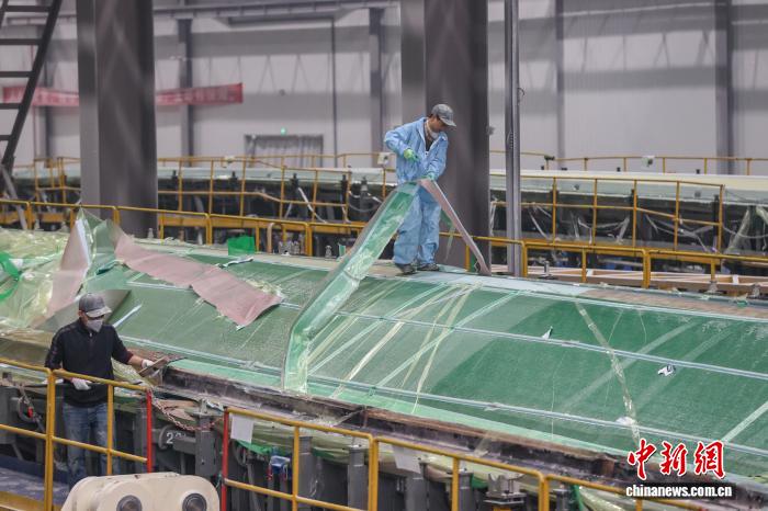 12月11日,工人在撕除风电叶片壳体辅材。记者 瞿宏伦 摄