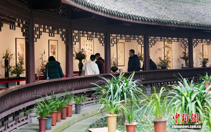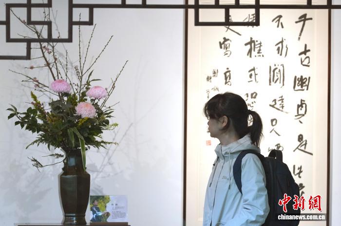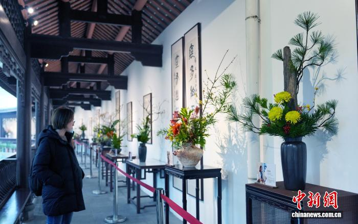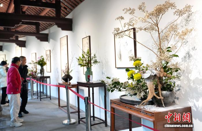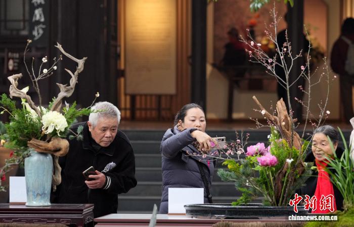 12月29日,四川省第一届“中国式插花”艺术展在成都杜甫草堂博物馆开展。此次展览由四川省花卉协会、成都杜甫草堂博物馆联合主办,以“诗花相和 梅香草堂”为主题,展览汇聚了众多插花艺术名家、青年花艺师50余件精品力作。图为观众参观展览。中新社记者 安源 摄