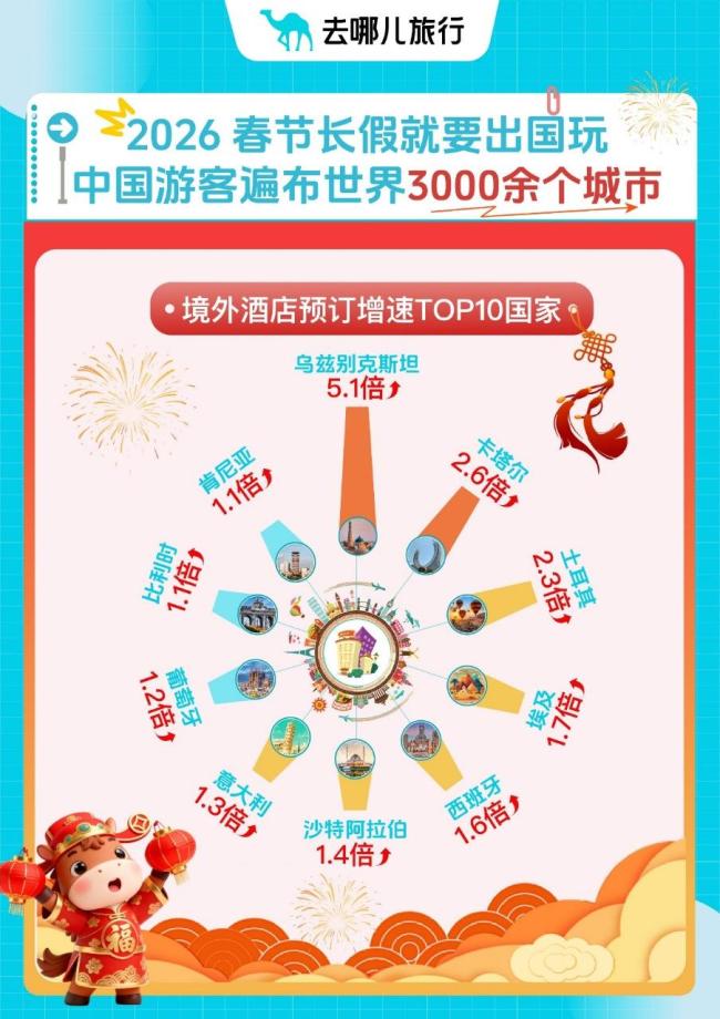 寒假春节期间,中国游客在全球3000余个城市预订了酒店,亚洲国家因航程短、签证便利、性价比高而备受青睐。长线出境游热度同样很高,西班牙、意大利、新西兰等长线目的地热度提升显著。土耳其自1月2日起对中国游客免签,寒假春节的酒店预订量同比增长2.3倍。