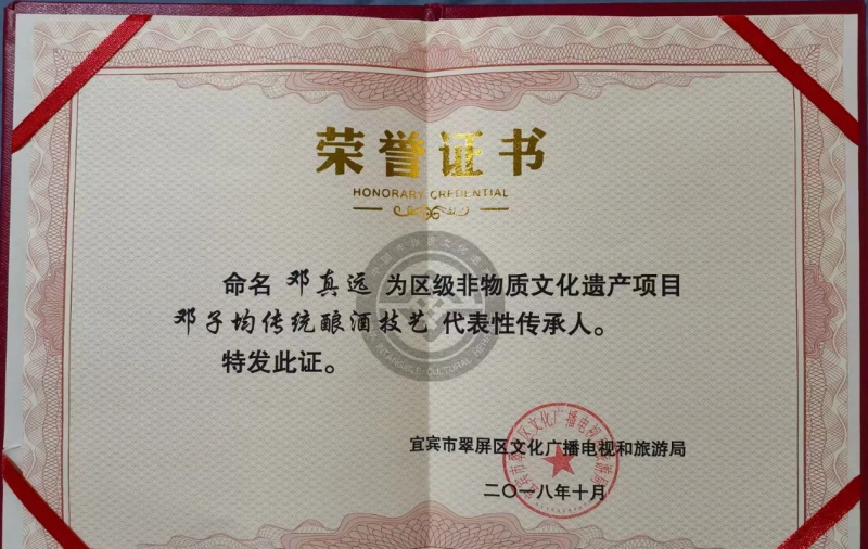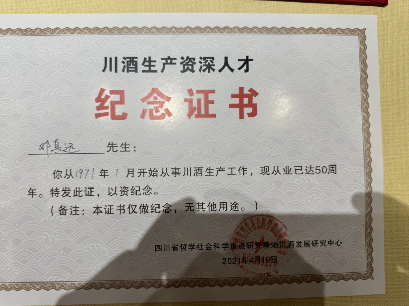 在产品斩获殊荣的同时,邓真远被确定为“邓子均传统酿酒技艺”代表性传承人。2021年获得“川酒生产资深人才(从业50周年)”的认定。五十年风雨兼程,他从未离开过那片氤氲着酒香的土地。从青年学徒到技艺宗师,从默默耕耘到行业标杆,他用整整半个世纪诠释了何为“择一事,终一生”。这份荣誉背后,是无数次的看窖观糟,是无数次的品鉴总结,更是对“酒品即人品”这一信念的终身践行。