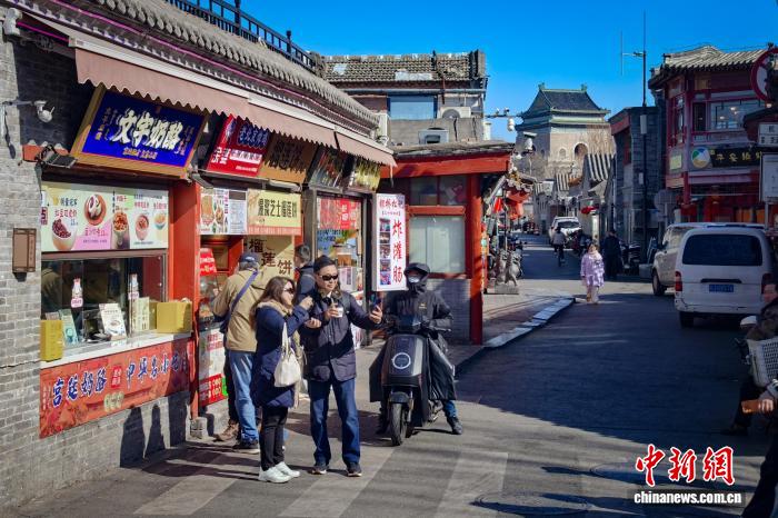 3月9日,北京,游客在烟袋斜街打卡游玩,享春日暖阳。中新社记者 佟郁 摄