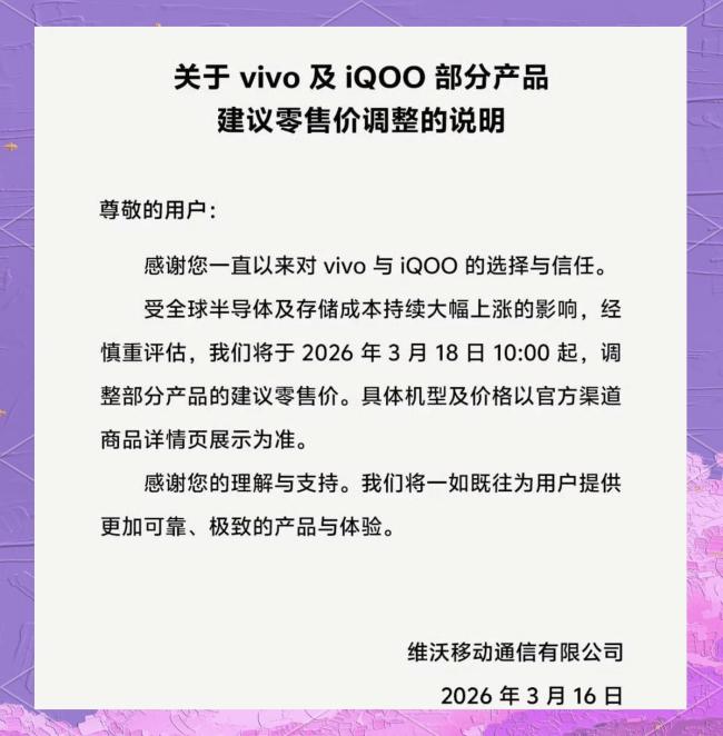 3月16日傍晚,vivo发布了一份关于部分产品建议零售价调整的说明,指出“半导体与存储成本飙升”是主要原因,并定于3月18日10:00开始执行。虽然没有透露具体涨幅,但暗示最终价格以官方渠道商品详情页为准。同一时段,OPPO与一加也同步发布公告,A系列、K系列及一加在售机型自3月16日起分批调价。公告措辞相似,均提到“成本压力快速向终端传导”。