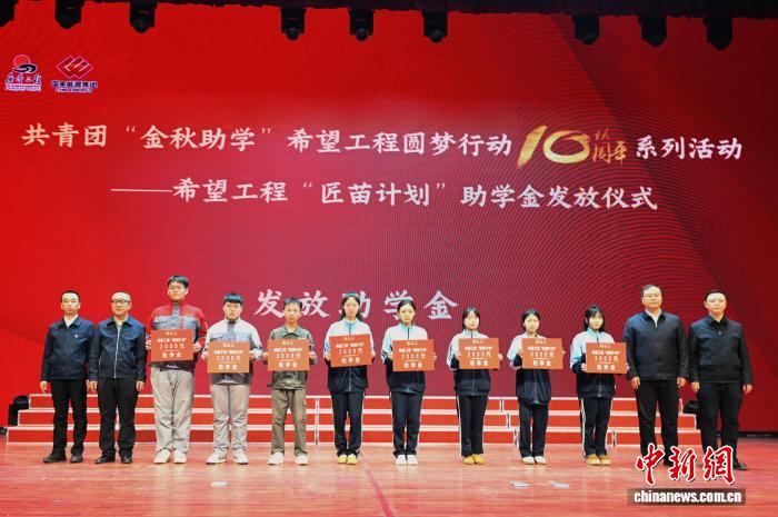 共青团“金秋助学”希望工程圆梦行动10周年系列活动——希望工程“匠苗计划”助学金发放仪式在哈尔滨技师学院举办。黑龙江省青少年发展基金会供图