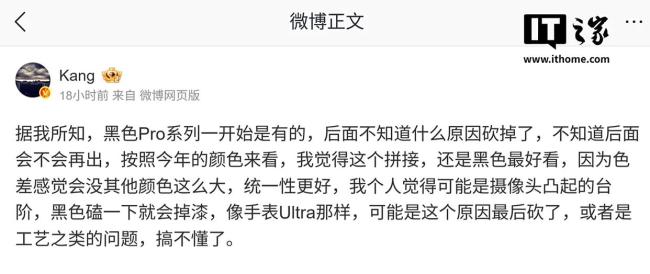 博主 @Kang 在微博上透露,苹果 iPhone 17 Pro 系列手机原本计划推出黑色版本,但后来被取消了。目前还不清楚未来机型中是否会重新引入黑色