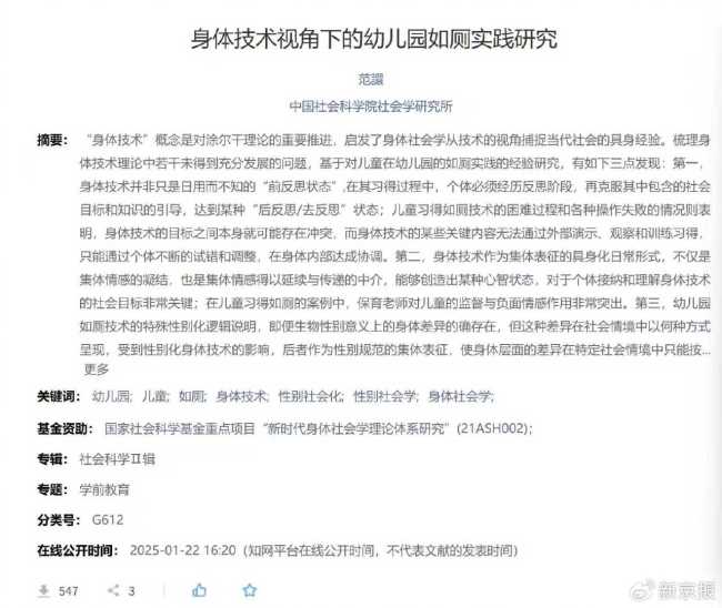 近日,一篇发表于《福建师范大学学报(哲学社会科学版)》的学术论文《身体技术视角下的幼儿园如厕实践研究》在网络上引发广泛争议。该论文详细描述了幼儿园男女童如厕时的具体姿势与过程,被指尺度较大,涉及儿童隐私保护及知情同意等伦理问题