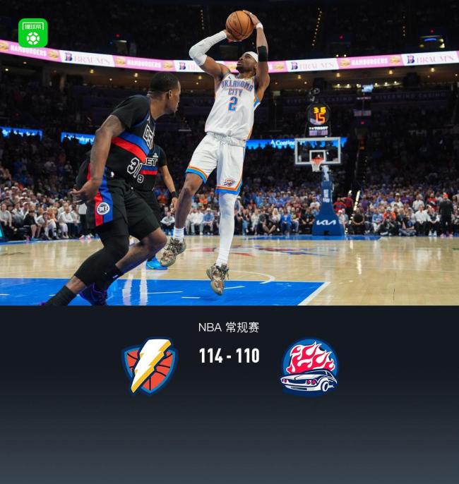 北京时间3月31日NBA常规赛,俄克拉荷马雷霆对阵底特律活塞。半场结束时雷霆以53-43领先,最终雷霆以114-110战胜活塞。比赛第一节,雷霆的亚历山大拿下7分,而活塞的贾文特-格林则贡献了5分,首节结束时雷霆以31-24领先