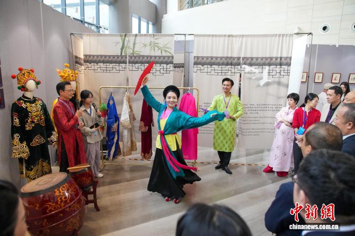 10月29日,丝路华章——第十二届中国—东盟(南宁)戏剧周戏剧艺术展在南宁博物馆正式开展。图为越南演员在现场表演越南嘲剧。中新社记者 陈冠言 摄