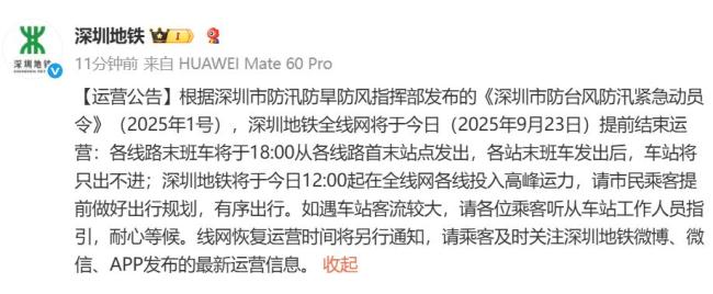 根据深圳市防汛防旱防风指挥部发布的紧急动员令,深圳地铁全线网将于2025年9月23日提前结束运营。各线路末班车将在18:00从首末站点发出,之后车站将只出不进。自今日12:00起,深圳地铁将在全线网各线投入高峰运力