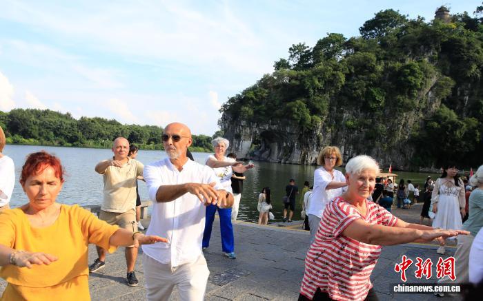 图为中奥太极爱好者共同练习健身气功。杨宗盛 摄 图为奥地利太极爱好者表演太极剑。杨宗盛 摄