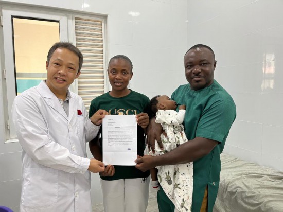 10月21日,胆囊结石患者塞西莉亚(中)及家人为第14批中国援加纳医疗队队长杨永光(左)送上感谢信。新华社发(第14批中国援加纳医疗队供图)新华社阿克拉10月28日电通讯|中国医疗队用微创手术治愈加纳