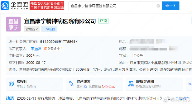 近日,记者从企查查平台了解到,宜昌康宁精神病医院有限公司因未按规定制定和实施医疗质量安全管理制度等被宜昌市夷陵区综合行政执法局警告并处罚款1万元。违法事实显示,该院《医疗机构执业许可证》上核准的床位数为70,2025年9月1该院收治住院病人...