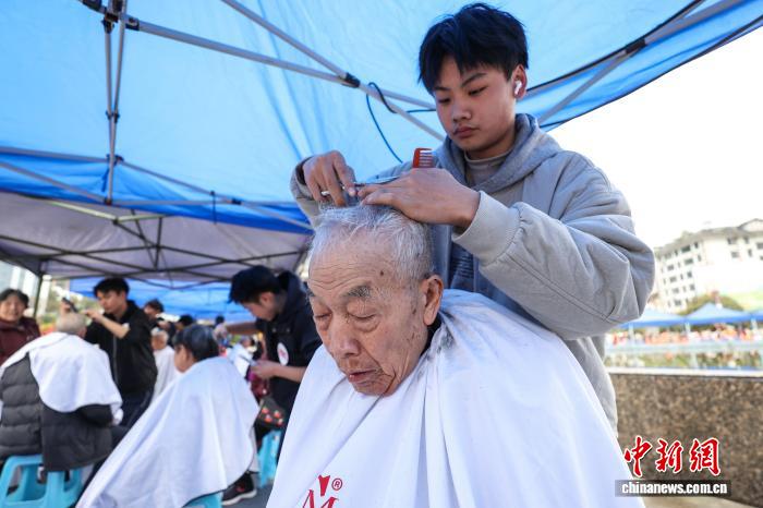 3月20日,农历二月初二,民间有“二月二,剃龙头”的传统习俗,贵州省遵义市红花岗区在遵义纪念广场举行“百人义剪”公益活动,为环卫工人、老人等免费理发。记者 瞿宏伦 摄