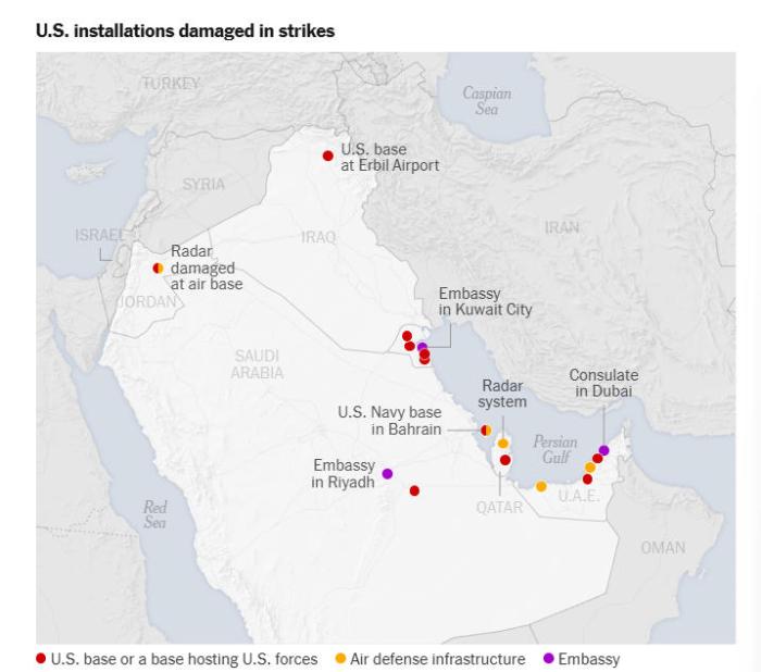 中新网3月11日电 据美国《纽约时报》11日报道,连日来,伊朗针对美国和以色列的袭击实施反击,向位于中东各地的美方目标发射无人机和导弹等。据统计,截至目前,至少已有17处美方设施遭到破坏,其中一些设施自冲突爆
