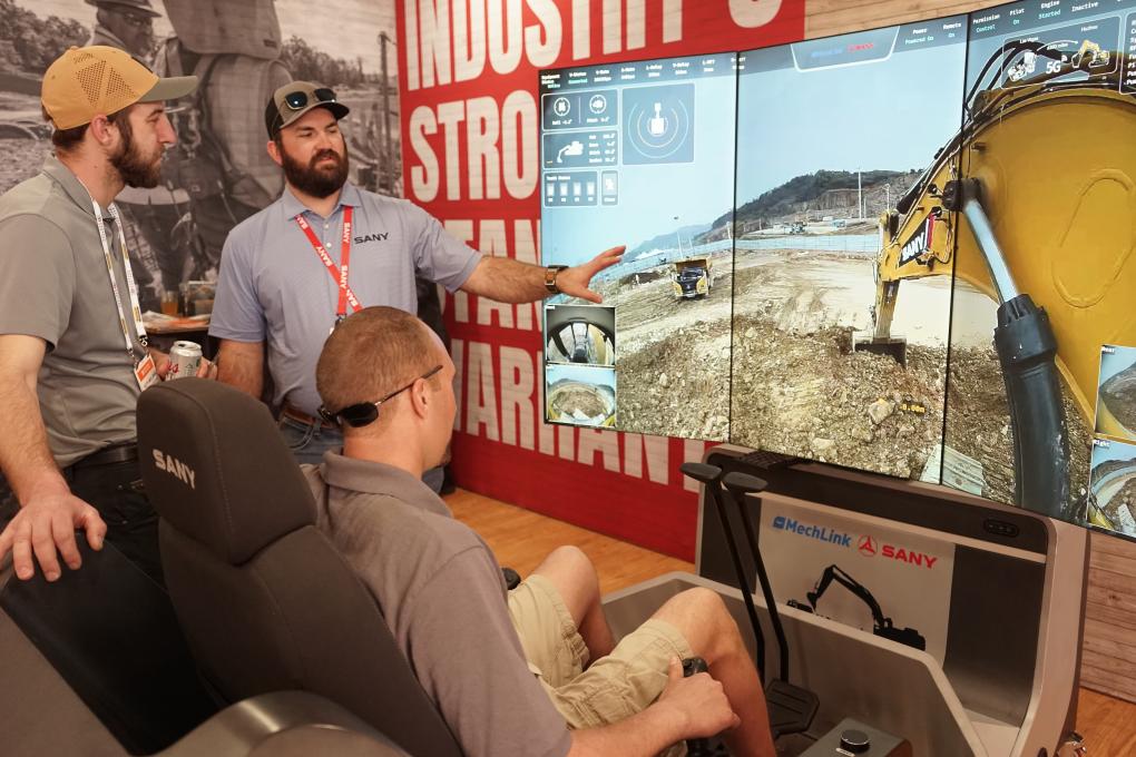 3月4日,在美国拉斯维加斯工程机械展上,参观者在三一重工展厅体验智能挖掘机器人系统。新华社发(曾慧摄) 新华社美国拉斯维加斯3月4日电 综述|中国工程机械企业携智能化成果加速融入全球高端市场